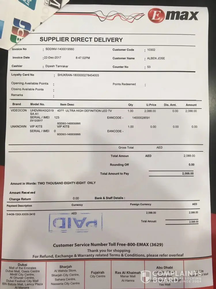 I purchased Videocon UHDVNV43Q519 led tv from emax Delma mall Abudhabi. Invoice number is SDDINV-[protected]. Wrong model number is delivered on 31 December 2017 in India. The delivered model is UHDVNV43Q549. So please replace with the purchased model.