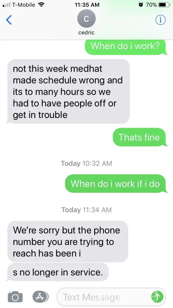 Hi im an employee actually a hostess and my manager cedric is bullying me. He says i am racist voted for trump and want to send all non whites out of the country. Also when i ask when i work next he sent me a text saying that the number is not in service and that its not fake. Clearly he is bullying me and im tired of it i asked for another managers number he said im the only one you can text so its a problem that hes the one bullying me