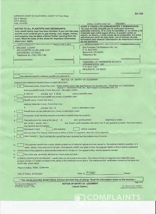 "I specifically asked Eileen about this and she verbally confidently ASSURED me that unlike other White Blue Eyed programs her White Blue Eyed cats were NOT deaf. She also originally had this stated on her website. " This statement clearly is a guarantee of no deafness at the time of purchase or in the future. Nowhere in the complaint does it say that Eileen Picket couldn't gaurantee deafness. I'm assuming the kids were young and it would probably be like having a broken toy. They don't know the difference, they just know it's not "normal". I think the small refund would be for misleading the buyer to think Eileen Pickets WBE cats were of a better line and not likely to be deaf, which is understandable. It's obvious they love the cat but don't blame them for complaining about being mislead.