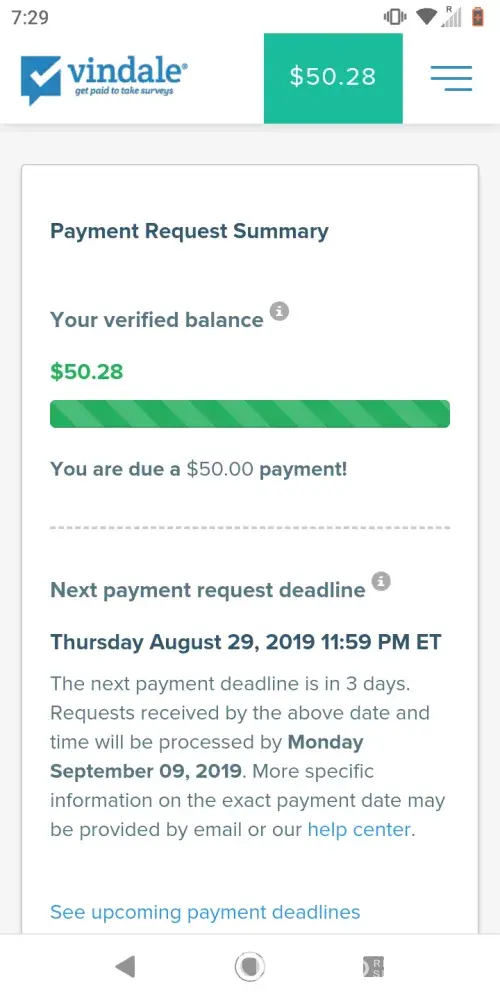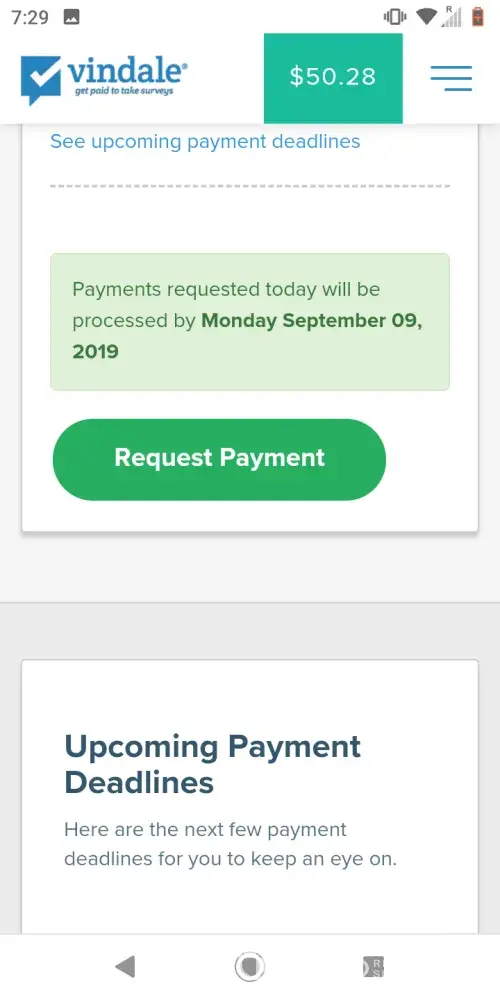 I have earned $37.75 to date. According to Vindale Research I can NOT request payment until I reach $50.00