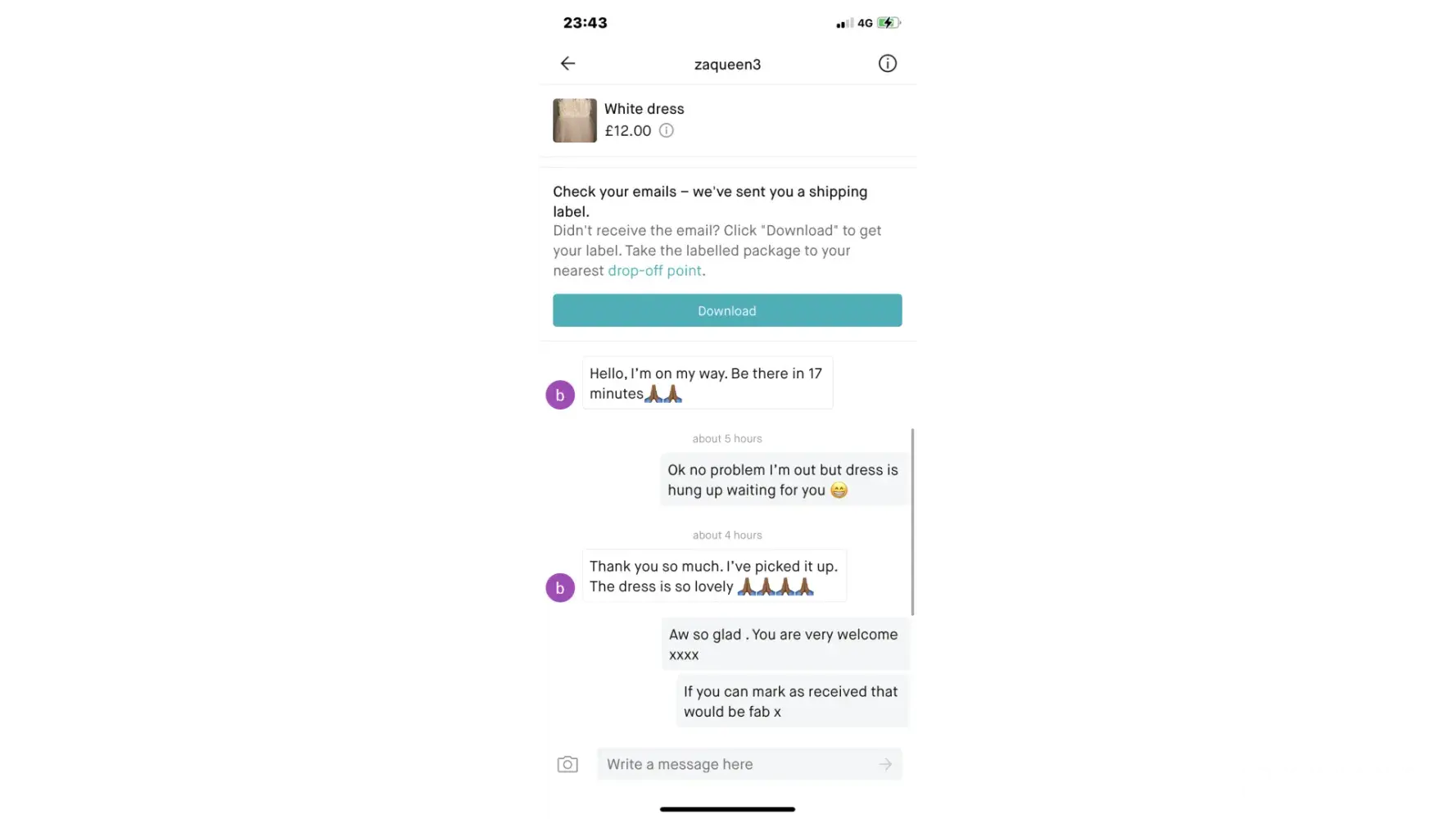 Please see photos attached of the conversation and myself from the buyer. It shows proof she collected the dress and was really happy with it.