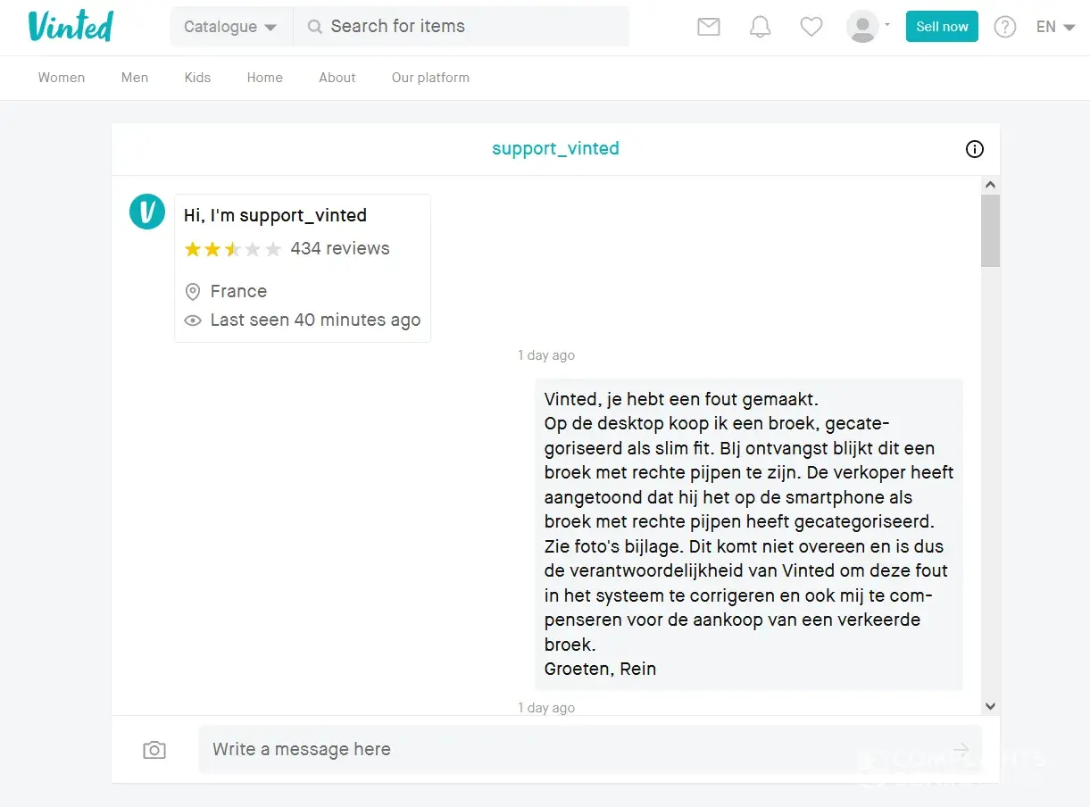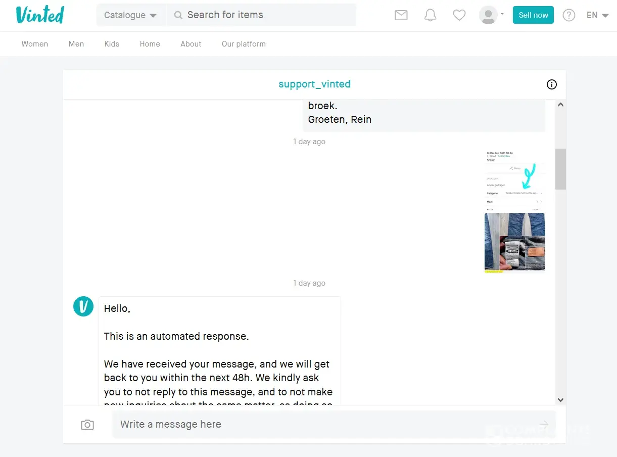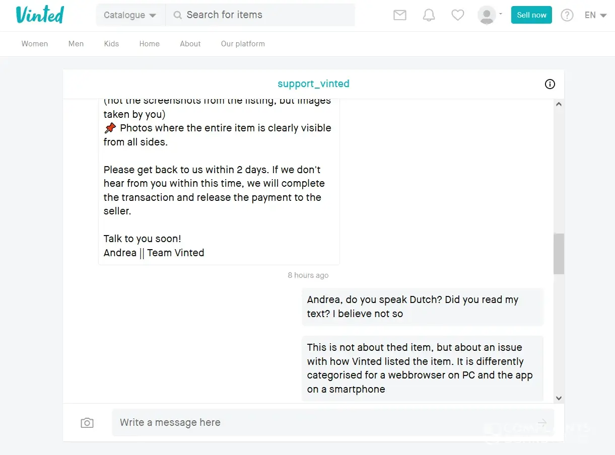 So while the money was still in escrow I decided to contact Vinted support in through a contact form on their website and told them about the issue with the item listing in Dutch.
