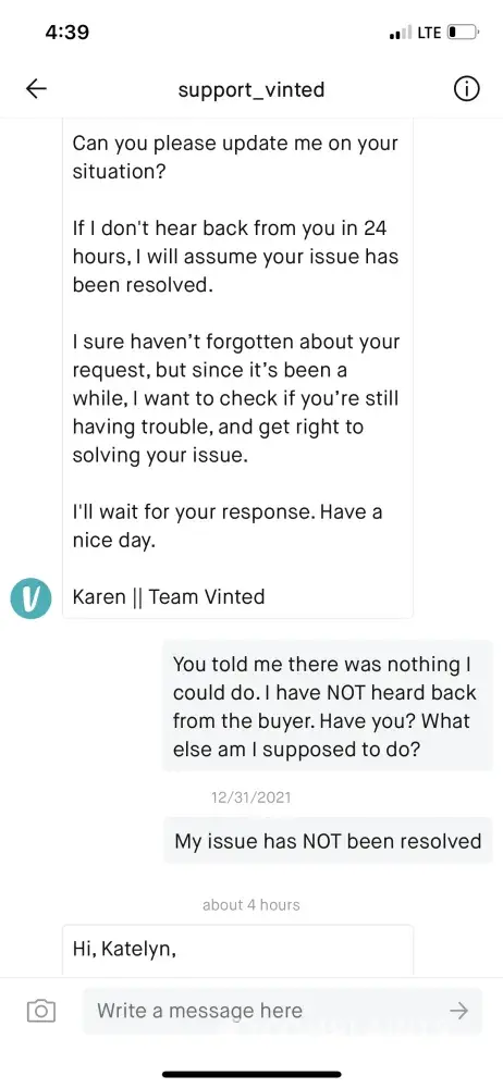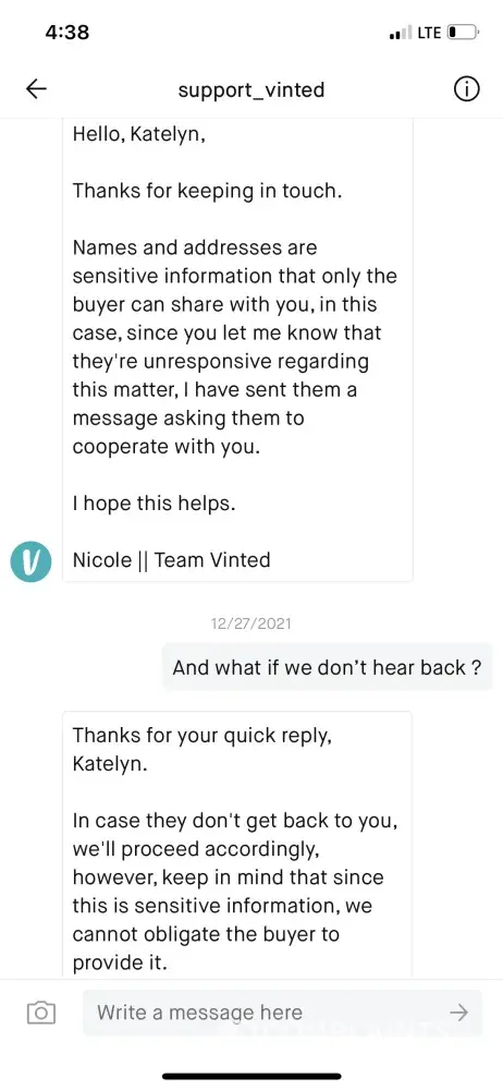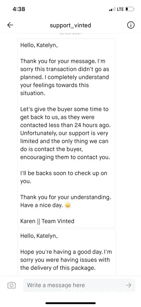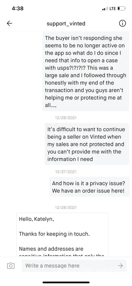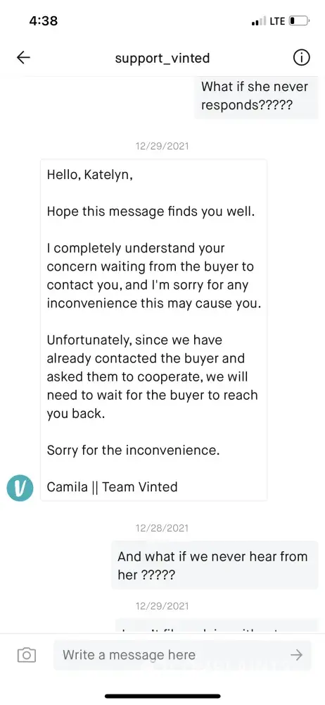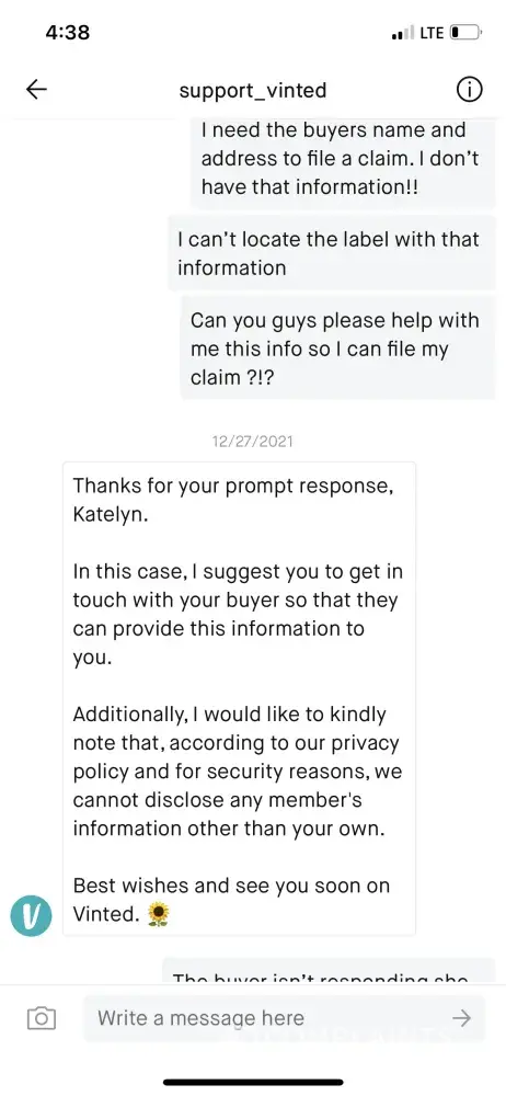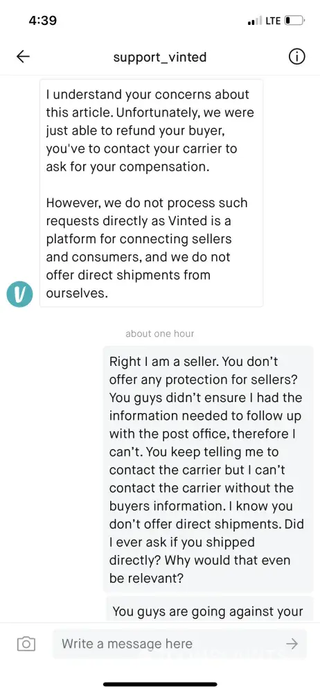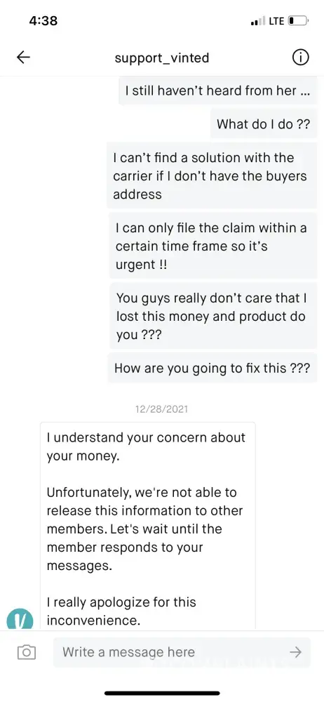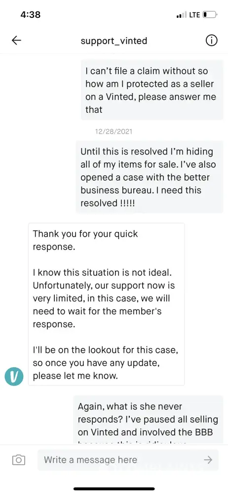 I don't feel Vinted are doing anything to help the situation or block the seller from the eating me which I've asked multiple times for them to do