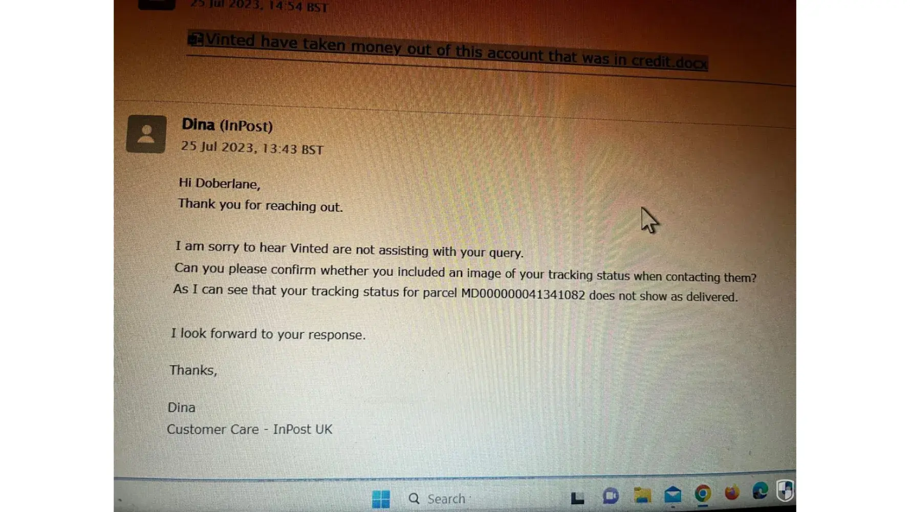 I filed a dispute on the 24th, and provided the email from Inpost. on the 25th and 26th, to many different Vinted team players, including Mahdi and yet the individual named messages seemingly have gone missing, and only the automated messages are left, why is that? All computer data can be traced.