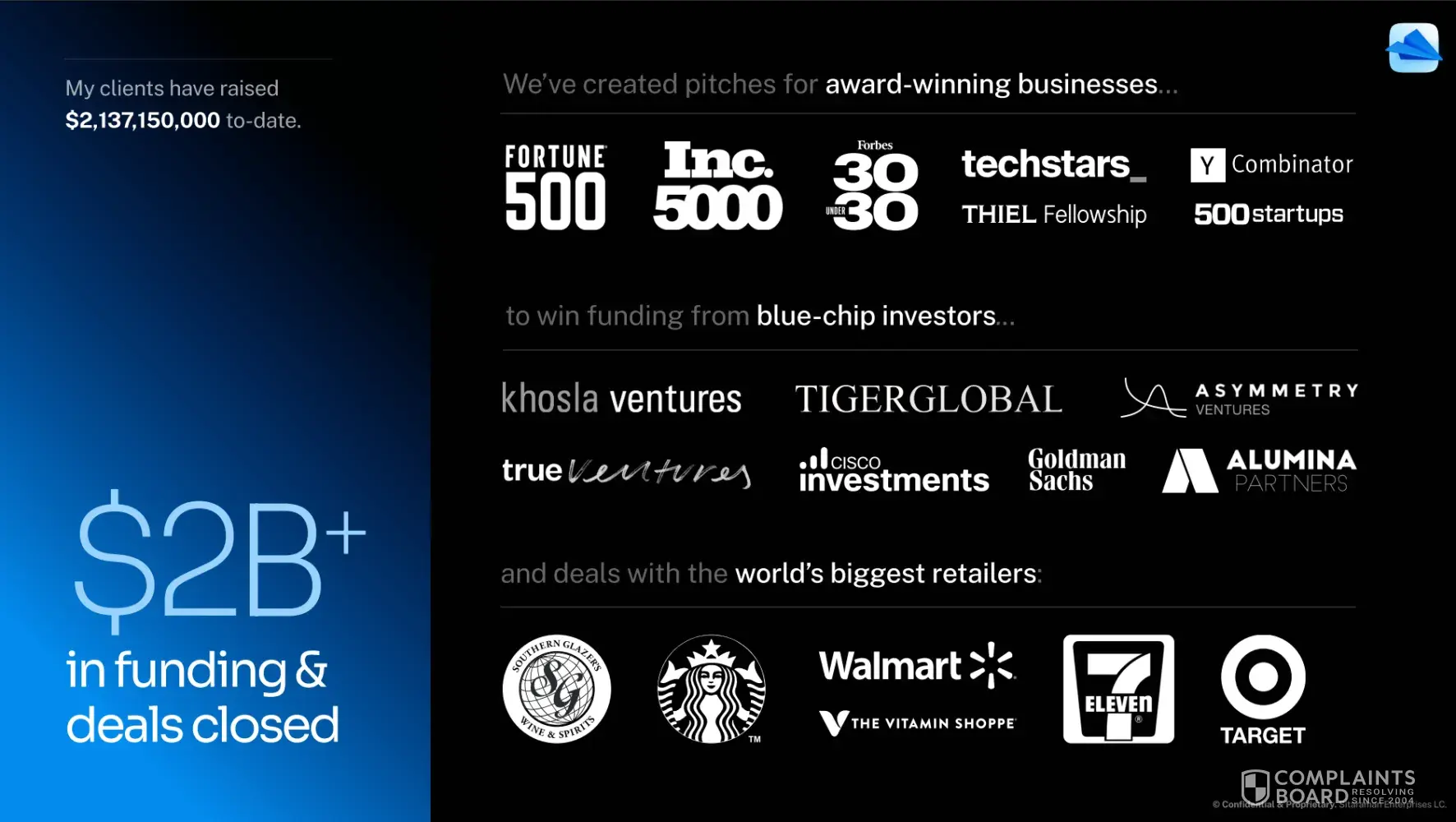 "We were looking to find a "pitch deck guru" to help tell our fundraising story…Can't say enough about how pleased we are with Vip's work product in all dimensions." -- Apr 2023