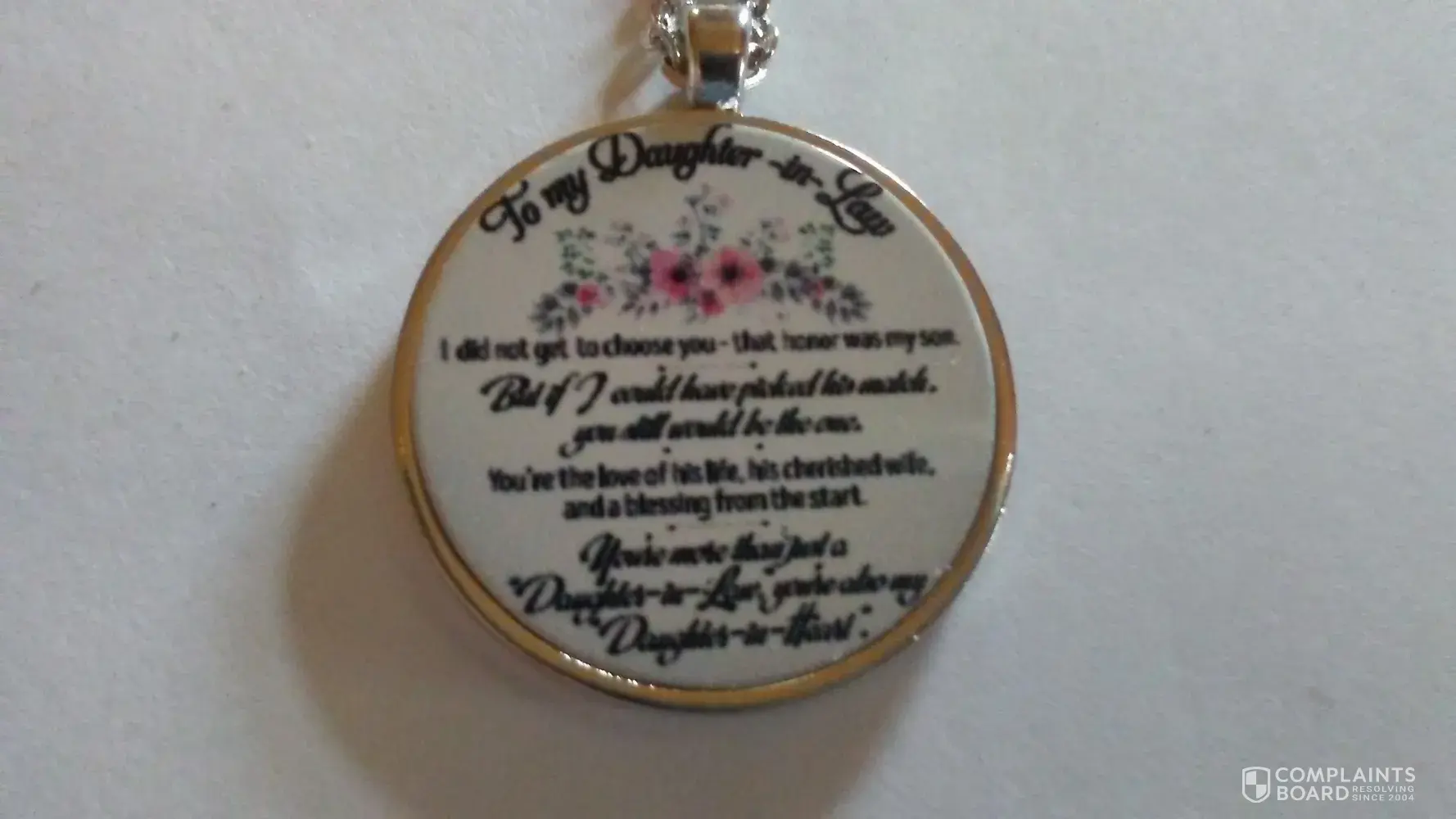 I bought a daughter-in-law necklace.recieved it, ani have triedd it is not as big as a quarter.i tried reading it with glasses and a magnifer, still can't read it.it is very poor quality of work.i have tried too reach them, all I get is a voice mail with no call back.did this 3 times.chatted with someone about 3 days ago, was told to send pictures, did that still no responce.i want to send it back and get a refund I don't want to call my credit card company, but seems like I will have too.all I want is to be treated like a paying customer.thank you very much.