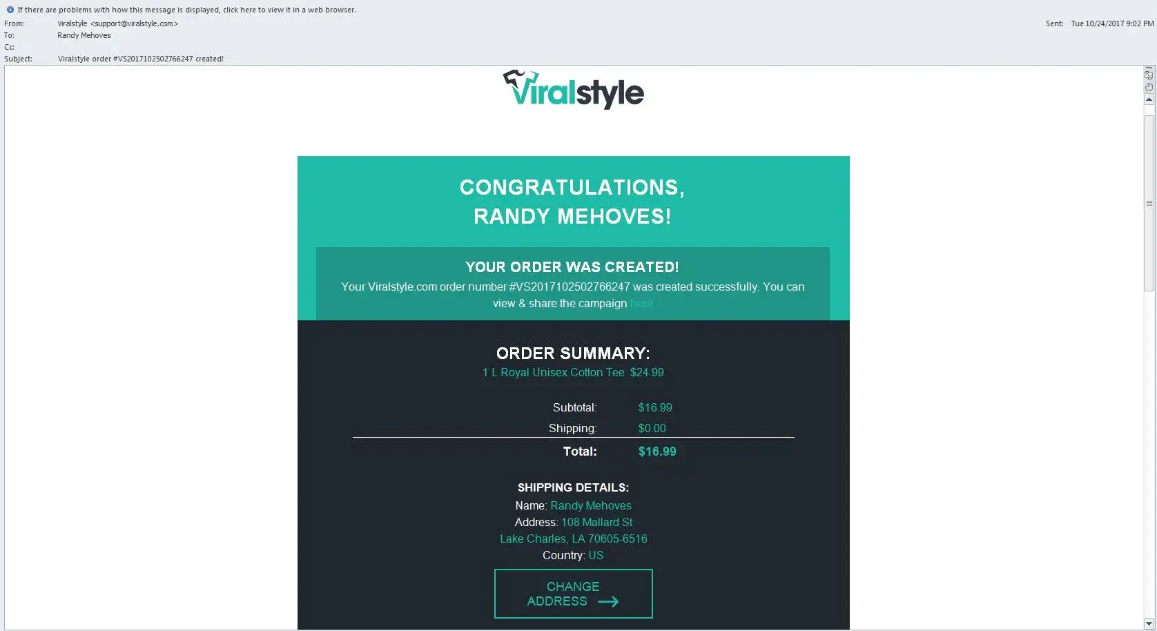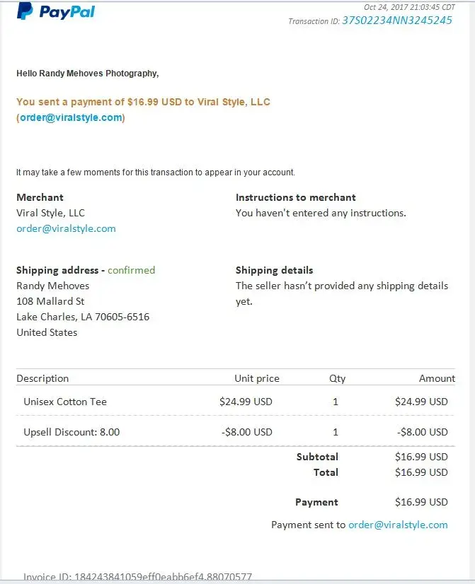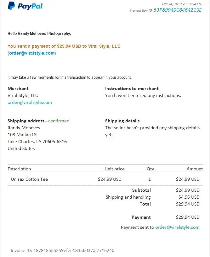 When I tried to get my money back for the original order that never went through they lied and told PayPal that they only received payment for the 2 shirts they sent. I appealed and showed PayPal the 3 payment confirmations through them and the 2 order confirmations from Viralstyle.