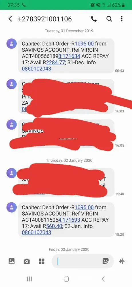 I am totally dis satisfied with my experience at Virgin. My account has been messed up by Virgin. Virgin says I owe R1095 when I have proved that I paid. I had opened the Virgin account through Capitec and then changed to Nedbank. I showed the transaction evidence; I was not believed! I was asked to show a full statement of the Capitec account to prove we...