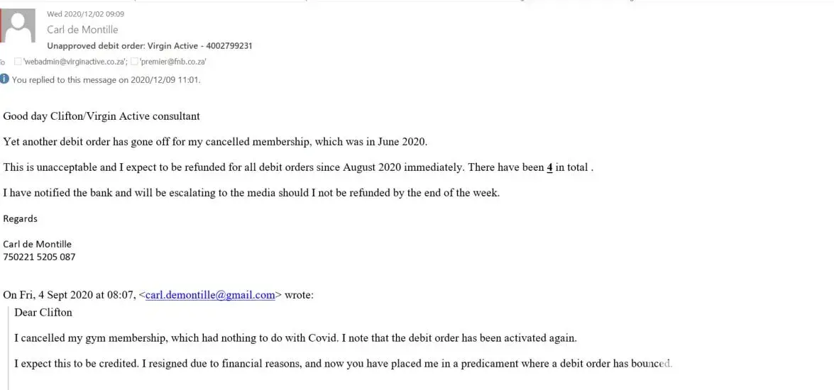 Virgin Active South Africa No feedback to my request to cancel my membership