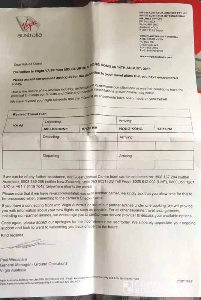 last Sunday my Flight on Virgin Australia (VA617 - N Class/5.30pm) was cancelled due to an overbooking.