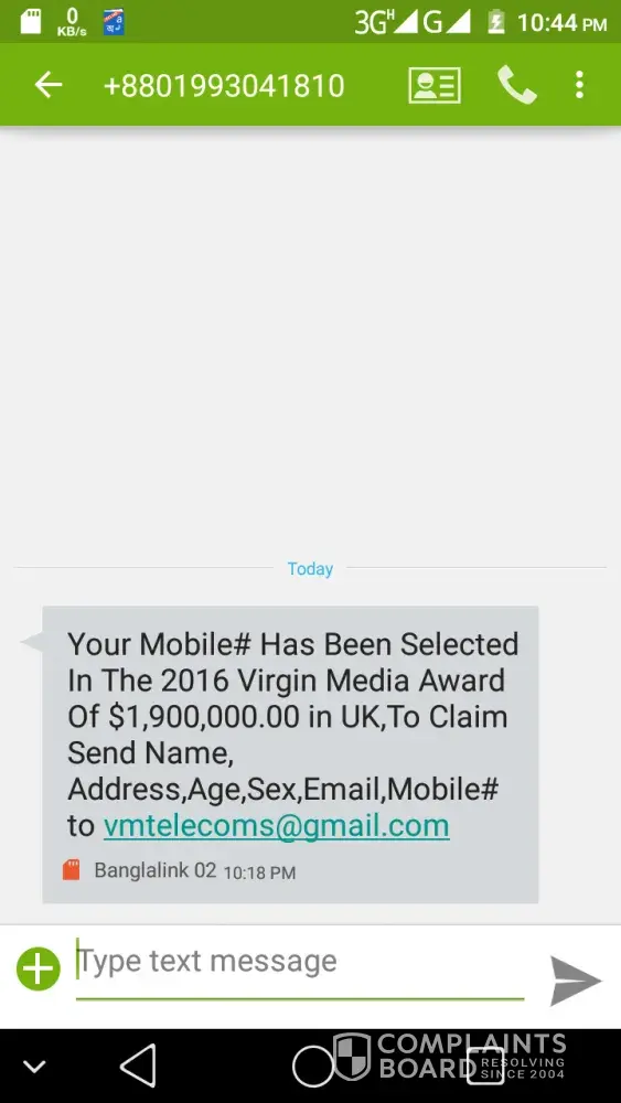 So please be careful. Last 3 month I have got more then 100 calls from many brothers & sisters who also got the same SMS or e-mail from that stupid Virgin Media Communication, Lotto America, Cocacola, Pepsi cola USA, e.c.t with huge amount of money offer.