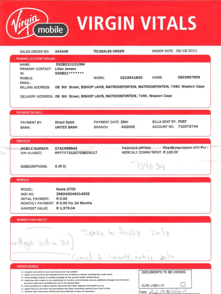 My cellphone contract was fully paid up so I phoned Virgin on the 20th August, spoke to "Happy" to forward a statement to me to verify that and he informed me that I can only get a statement in October because I needed to notify them one month prior to date. I disputed this and contacted "Hello Peter" to establish if this is even legal. Why should the client notify them when a contract is legally finished, they should phone client to enquire if the client wishes to continue, I really think the consumer board should make that an issue with all cellphone companies. Long story short, they handed me over to a collection agency, who handed me over to an attorney. The payment I made per month was R122.00. The attorney's letter dated 4/9/2014 said I have been handed over for the amount of R389.00 plus costs. Where does one month extra come to that amount. Then I received a statement from collection agency dated 9/10/2014 which shows outstanding amount as R439.88 which obviously included their costs.