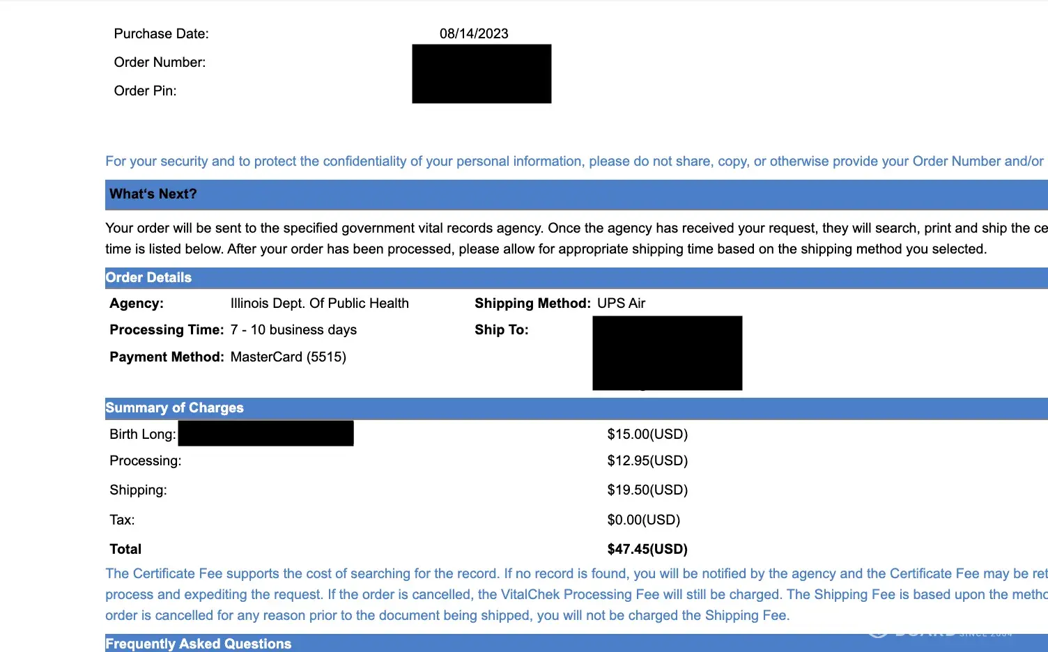 Please! Please! Please NEVER order express from vitalchek.com! If you're going to use them, just order everything the "regular" way.