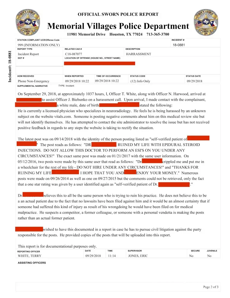 After filing a police report of harassment and sending it to Vitals, we finally got a response. But only one response. They removed *some* of the harassing comments and then went off the grid again. To no avail, the person stalking the doctor I represent was back online the next day, posting nasty, harassing comments. How disgusting!
