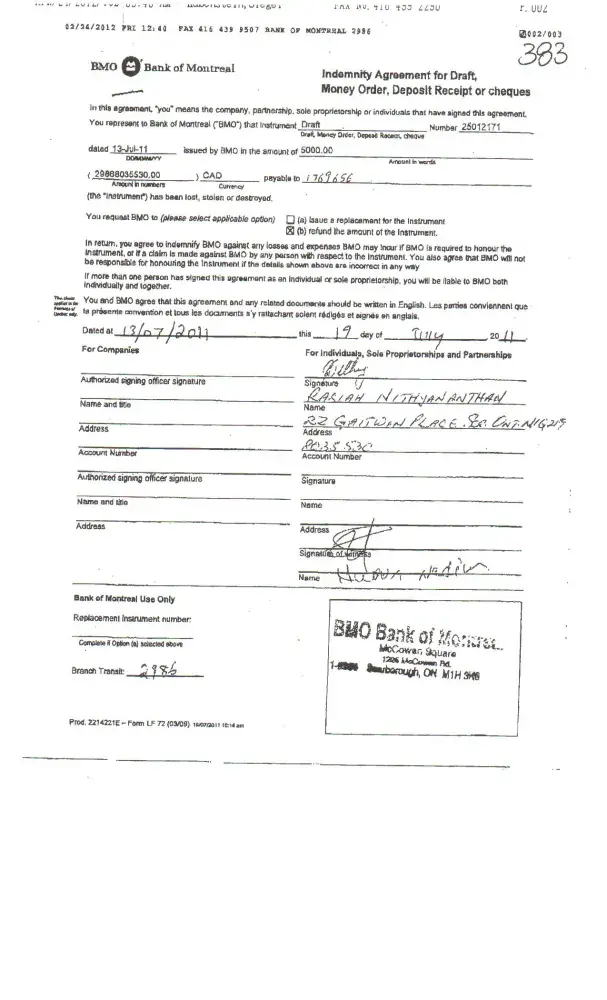Rasiah Nithiyanathan (Yamunakumari Nithiyanatahn's husband) has stolen a bank draft from BMO in the amount of $5, 000.00 on July 13, 2011 and made a payment to the Lender. It has been returned, then BMO terminated an employee who helped him to get this bank draft, these people all ways trying to steal something .