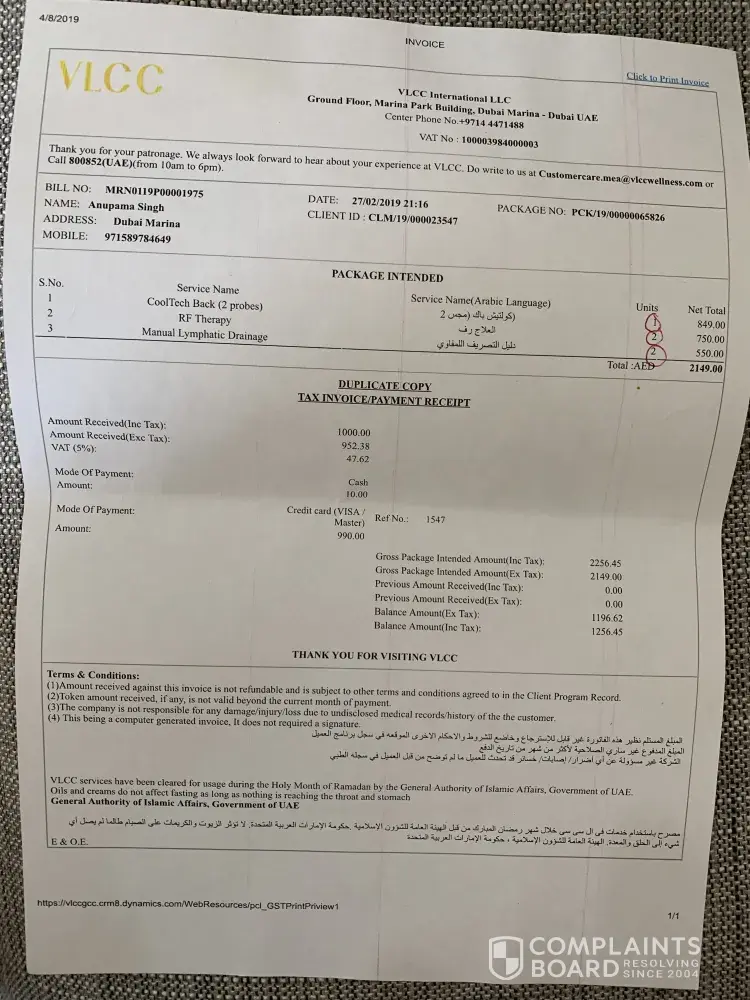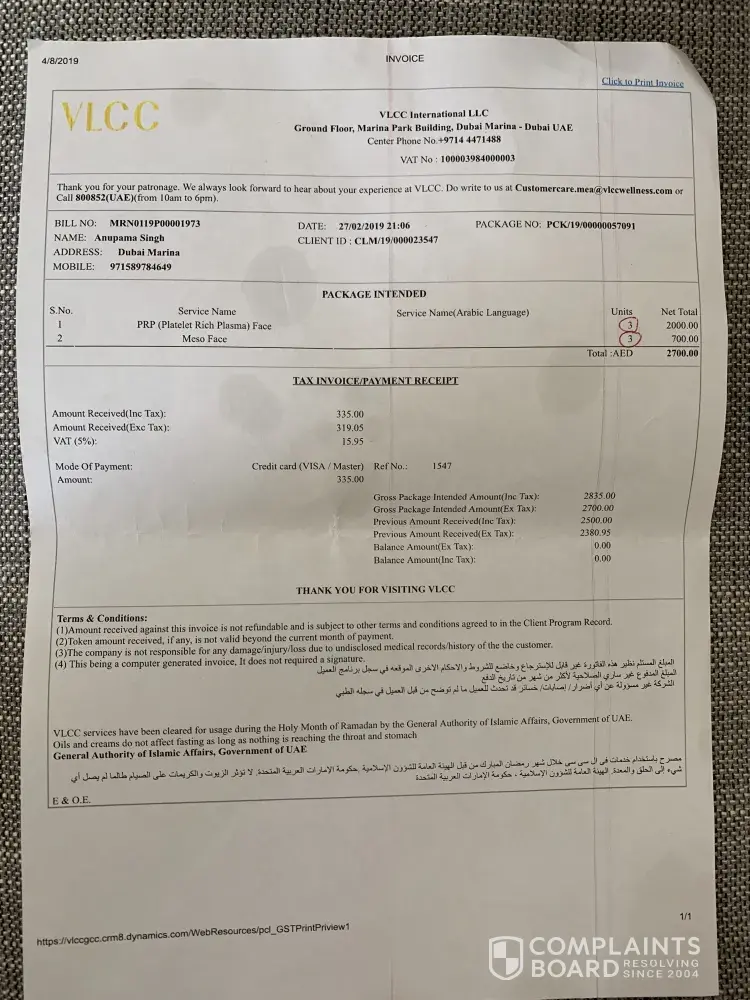 no transparancy in billing even no fixed rate of any service. i hv taken 10kgs weight loss programe & paid 76100 n 57k for gold micro botox for 6 session (which is yet to start) but till date didnn't get any invoice. They demand full payment before treatment either they start or not . I have make the pay On 18 jun 2019 & it is 5 of jul but i didn't get proper invoice with service details which i have taken. No any rate list in centre ... i think vlcc as well as their Rep are making fool to their customers. if i hv paid for gst they should provide proper bill. Even you are going for threading, hair cut or any service u will have to pay the GST but without invoice... also want 2 say something about points counting if i hv 2368 point it should be count in rs. 2368 but VLCC count 1 point equal to 30 paise.. its robbery . i will never ever suggest any body to go for VLCC SERVICE...