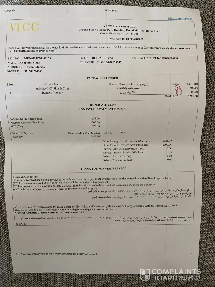 When I confronted them and asked for my receipt they told me they'll search and talk to people and then message me. I didn't receive any reply or message. VLCC doesn't have any customer care service so I've taken the mail address from Google and I'm asking to resolve the matter.