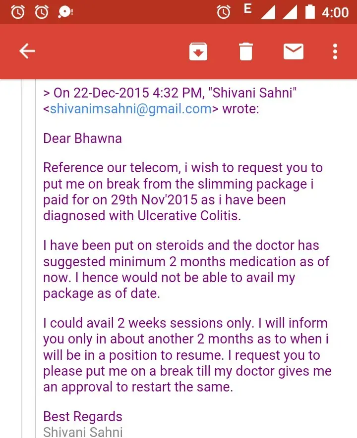 I was shocked about their communication gap leading to my ill health. Since then I have written multiple mails to Ms Neeru and customer care of VLCC and had spoken to Ms Shweta, Area Head who too called me atleast after 7-8 days of my mail and word with customer care representative. The last she asked me to meet their doctor with all my reports so as to get another alternative therapy and that they will not refund my money. My question is having suffered twice and staying at the mercy of VLCC's employees to offer proper services, why should I stake my health further?