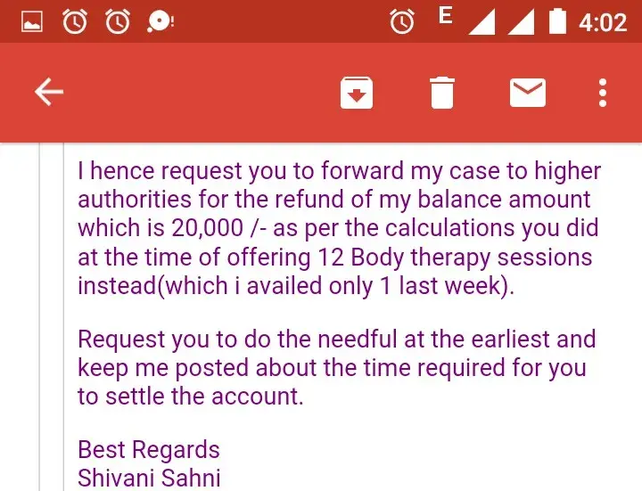 I met her sometime around first or second week of March and shared my agony and that I wish to quit. I clearly shared that I am a single parent of 2 young kids and have their responsibility on my shoulders and hence can't take any stake on my health n body and that I am immensly dissatisfied with the services. She did some calculations and concluded for a refund of some 23000/-. However, insisted on body therapy as the alternative to the initial package I took. I completely denied but was enrolled with her selling skills, apologies for previous experiences and claims of providing better services. I very clearly mentioned that I will take one session and then decide whether to continue or not depending on its effect to which she agreed.
