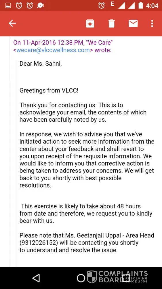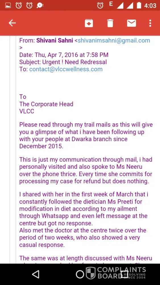 I am attaching few of the screenshots of my mails sent to Dwarka Sector 11 centre and the corporate office of VLCC for reference.