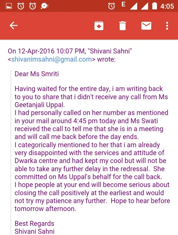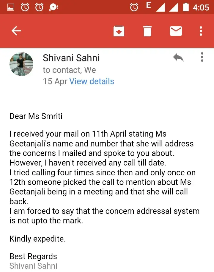 Post sending mails, the centre head, pratiksha, the counsellor, sonal, and the zonal head has called me many times accepting that there has been a mistake on