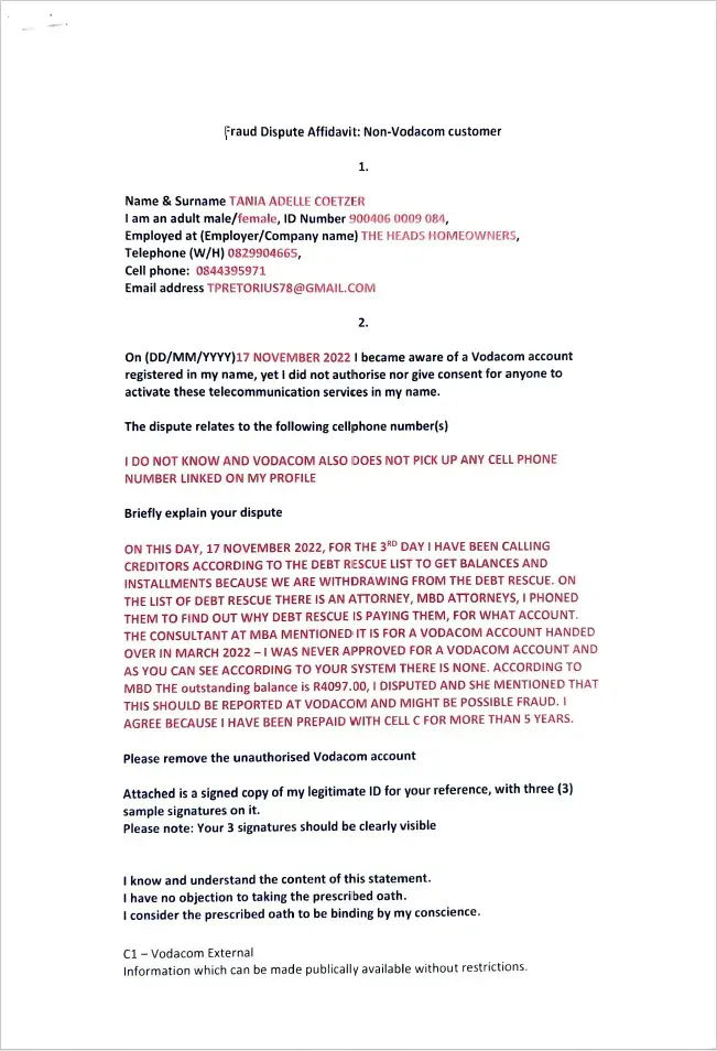On this day, 17 november 2022, for the 3rd day I have been calling creditors according to the debt rescue list to get balances and installments because we are withdrawing from the debt rescue. On the list of debt rescue there is an attorney, mbd attorneys, I phoned them to find out why debt rescue is paying them, and for what account. The consultant at mba mentioned it is for a vodacom account handed over in march 2022 – I was never approved for a vodacom account and as you can see according to your system there is none. According to mbd, the outstanding balance is r4097.00, I disputed and she mentioned that this should be reported at vodacom and might be possible fraud. I agree because I have been prepaid with cell c for more than 5 years.