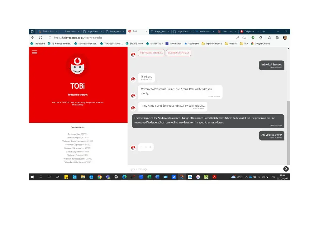 6 January 2023 @ 11:23 - I've used the online chat service 'TOBI' and submitted my question relating to a Vodacom e-mail address to be used to submit a Vodacom Insurance Change of Insurance Cover Details form, but Lindi Sthembile Ndlovu did not provide any response, just left the questions unanswered. I include a screenshot of our chat below, where the question has still not been answered, neither did she respond in any way, not even to say that she will come back to me.