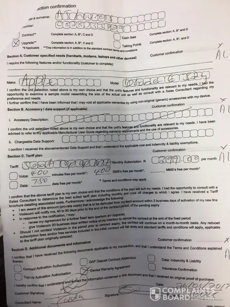 I have upgraded my cell phone in May 2017. My contract was for an Appel iphone on smart Top up M+ for R399 on contract and signed for. End of May the total was R518 due to the last payment of my old hand set of R120 fine... In June 2017 my Statement is for R480 (No old handset included but the discount not added). When I went to Vodacom to ask about it, they said that Vodacom "forgot" to add the discount of R80. They did do a service log on 15.06.2017 about the problem. When I phoned Vodacom on 082111 they said that Vodacom Woodlands (where I did my upgrade) sold me an "expired deal"... according to Nkeletseng at Vodacom cuntomer care. I went back to Vodacom Woodlands a week after and spoke to Eben and Rita (Manager) and they sent in another e-mail to "Michelle" to escalate and sort it out... still not sorted... Now my Statement for July is R518 again...(old hand set included). I went to Vodacom Woodland again today and Nobody can give me answers. My binding Contarcat between me and Vodacom is R399... but they are not billing me for it. I do have proof of this all... Why do we have a contract if Vodacom does not bind to it...