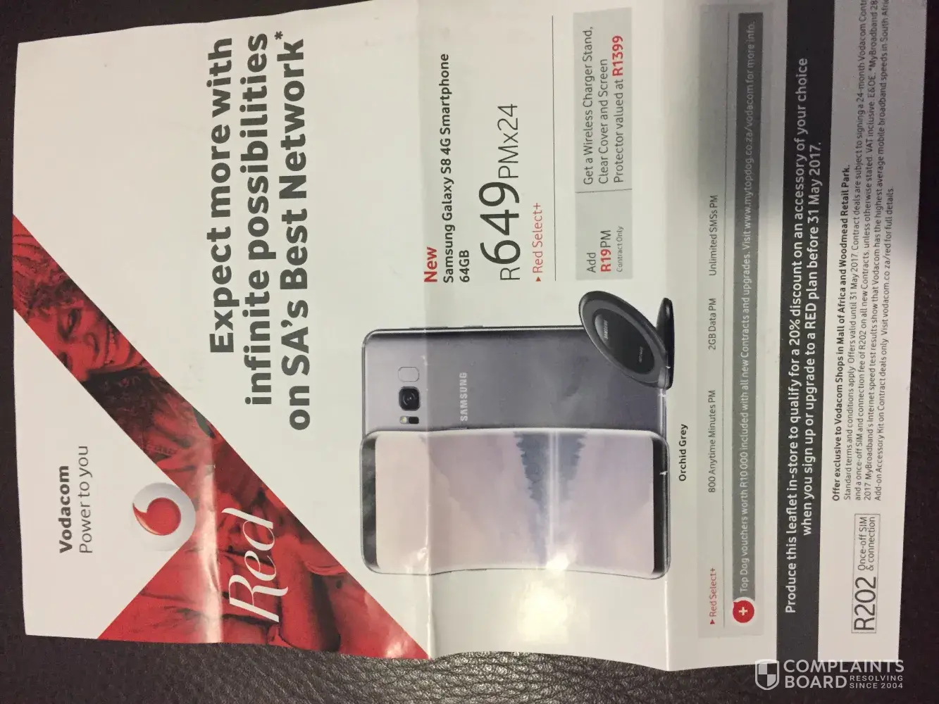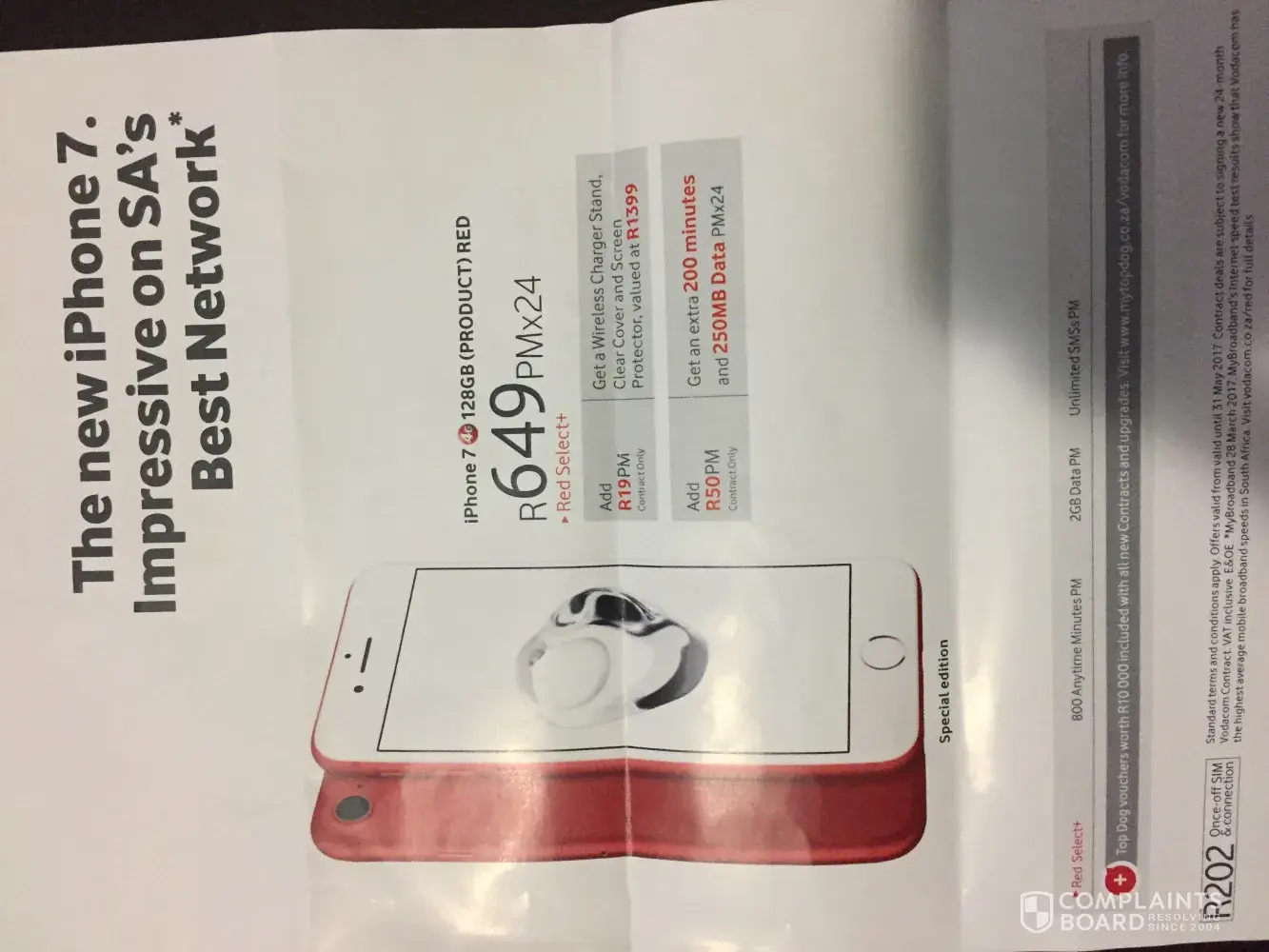 Good day, I am writing to express my severe dissatisfaction in Vodacom. On Saturday, whilst at a stop street in Kyalami; I received a Vodacom pamphlet from a Vodacom representative advertising for the new iPhone 7, as well the Samsung S8. The pamphlet clearly states the Red Select + package at R649 per mnth, for the 128gb red iPhone, as well as the offer is limited to the Vodacom shops in Mall of africa, as well as Woodmead retail park, valid till 31 May 2017. I decided to go straight to the Mall of africa to sign up for the advertised deal. The staff were well aware of the package; however I was unable to sign up immediately, as I still needed to port from my current service provider. The sales consultant took down my details adding to a list in her notebook already populated and confirmed that she would order me a phone, and that the moment my number was converted to prepaid, I should come in and sign up. I converted my number at 8am this morning (as the service provider cancellations department is closed on the weekend). I also gathered the relevant information, bank statements etc. I then drove to the Mall of africa after work, to sign up and collect my phone. To my dissatisfaction, upon getting there, I was advised by the Vodacom store consultant that Vodacom had apparently misprinted these pamphlets and that they will not be honouring the deal. I find this completely unacceptable, as this is a misrepresentation and I demand the deal be honoured, as I plan on taking this matter further.. As per the South African Consumer Protection Act, No. 68 of 2008, signed on 24 April 2009, the purpose of which is to protect the interests of all consumers. I refer to 'Right to fair and honest dealing' and 'the right to protection against false, misleading or deceptive representations'. Vodacom is not permitted to provide, deceptive or misleading representations regarding services and products! A Vodacom representative needs to contact me immediately.