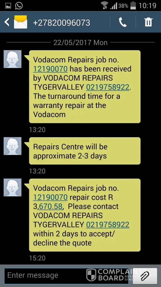 I took my phone in at Vodacom Tygervalley and three days later I got a message saying, the repair cost will be R3670.58