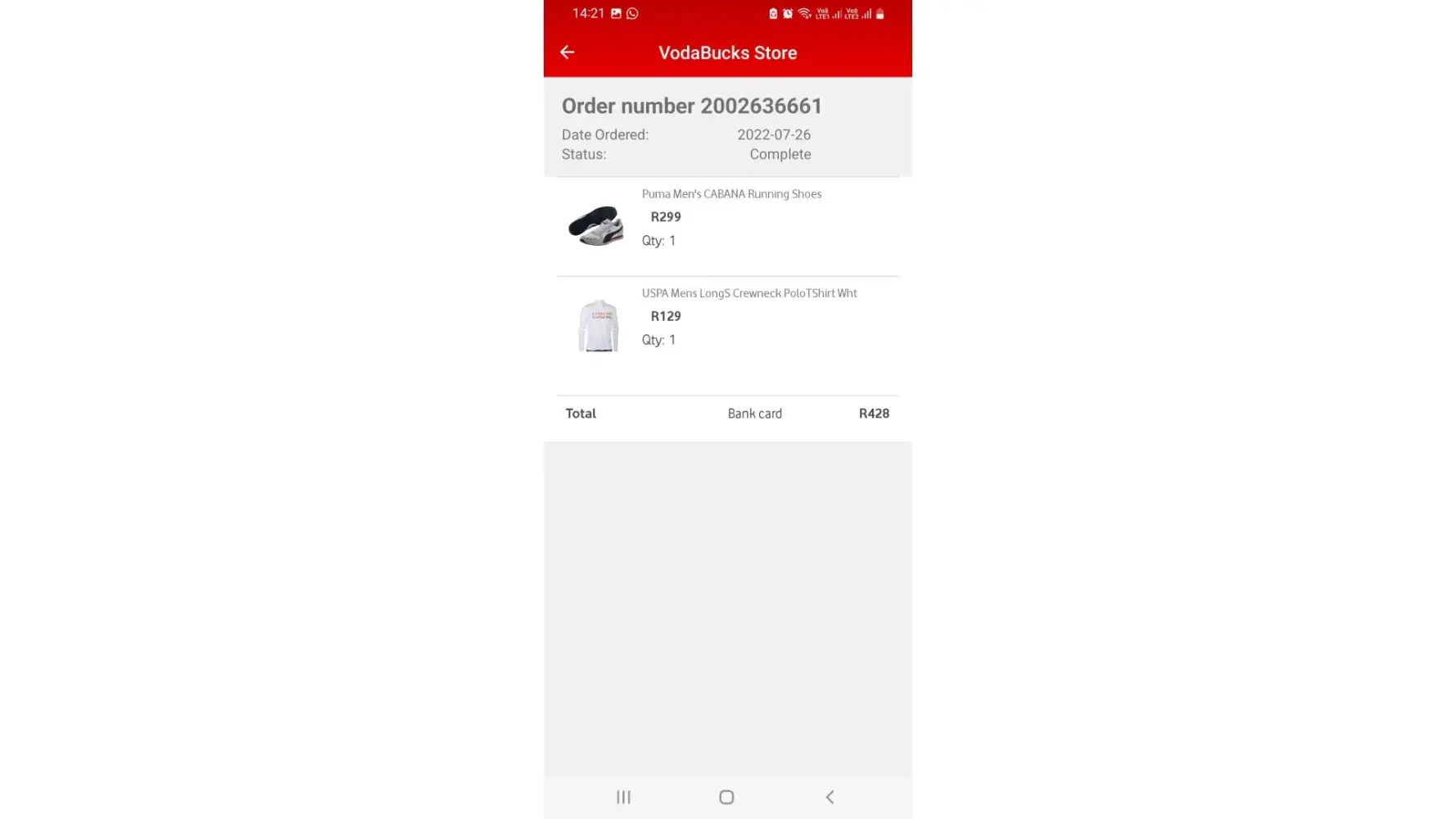 3 days later my tshirt was delivered to me but nothing about the takkie. I have since been trying every number vodacom has to get refunded for the takkies to no avail, I keep getting redirected to a useless bot who is unable to assist.