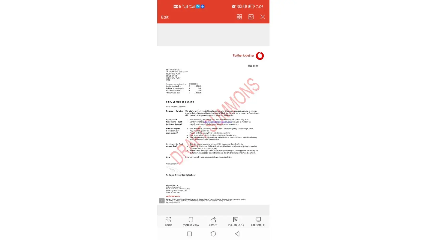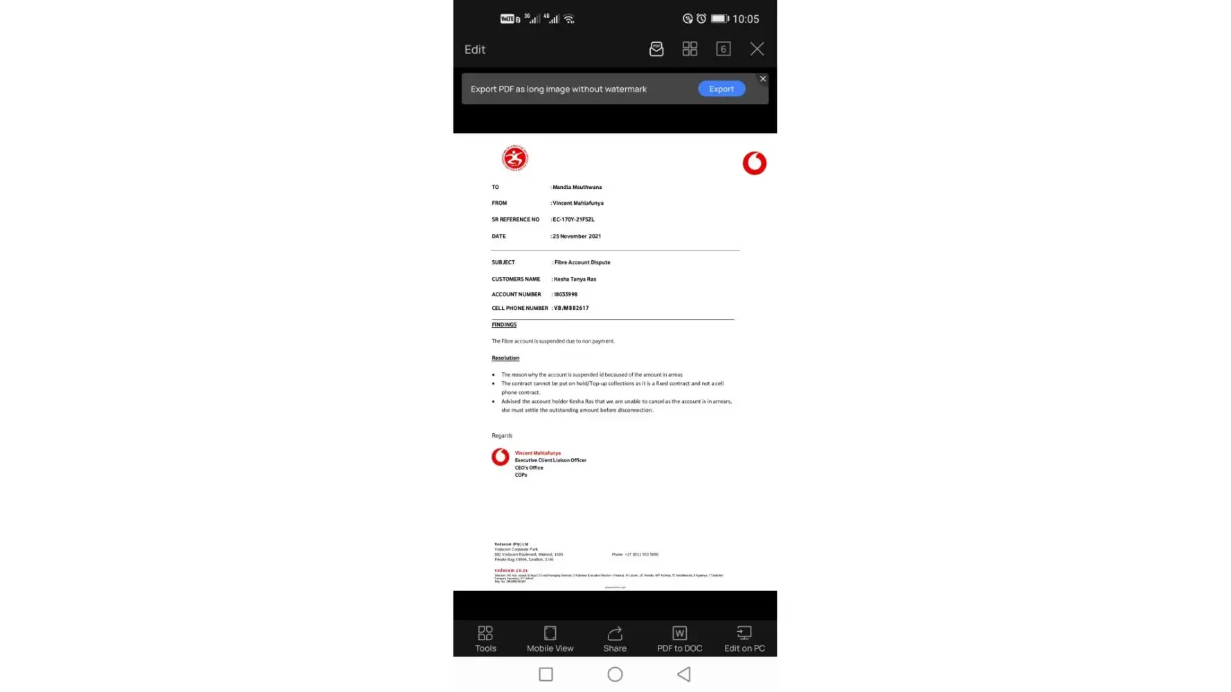 Vodacom Request for Settlement letter for the past 8 months