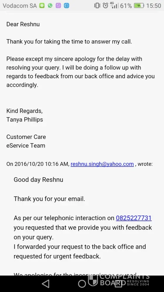 So I logged a complaint almost a month ago regarding missing data and airtime. To date No one can provide me with feedback and every time that I email they call to say that my email has been forwarded to back office. How hard can it be to resolve? How busy can back office be?
