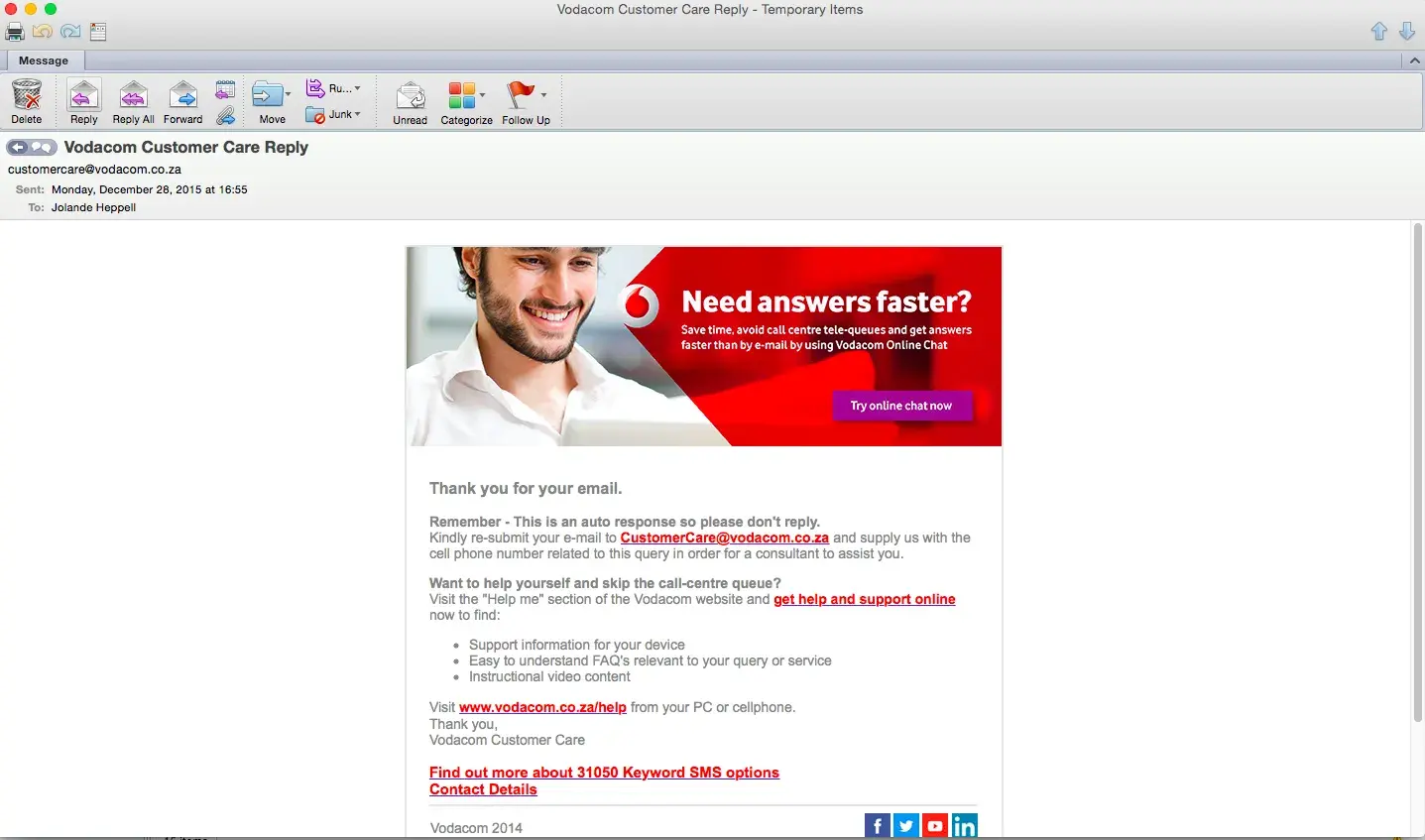 so regardless to say my matter is still not resolved, because I have to drive up and down between Vodacom outlets and work, being on the phone for almost half an hour twice nothing can be done.