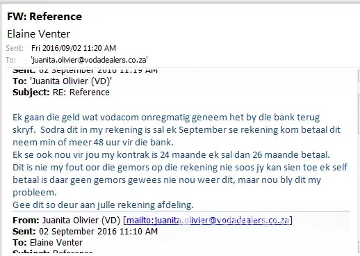 the next day, Monday (05/09/2016) I went to the nearest Vodacom outlet, where the lady "helped" me. She provided me with a reference number, and emailed the proof (letter that is signed by account holder) that I may proceed with any matters/ queries with the account.