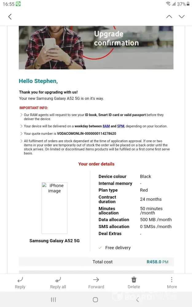 On 18th August I processed an online upgrade application for a Samsung A52 5G phone. I received a "Upgrade Confirmation" email the same day that my new device is on its way. The email confirmed the device, plan type, contract duration, minutes & data allocation, and total cost of R458.00 pm.