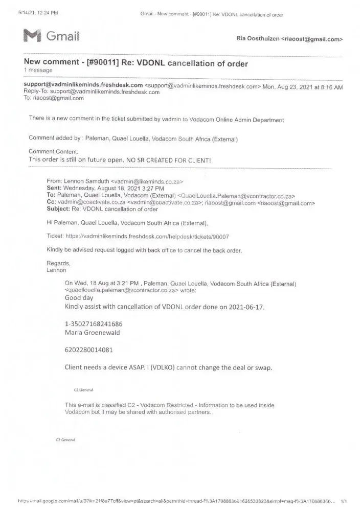 Desired outcome: I want Vodacom to honour their confirmation of my new contract and deliver the device as confirmed by them.