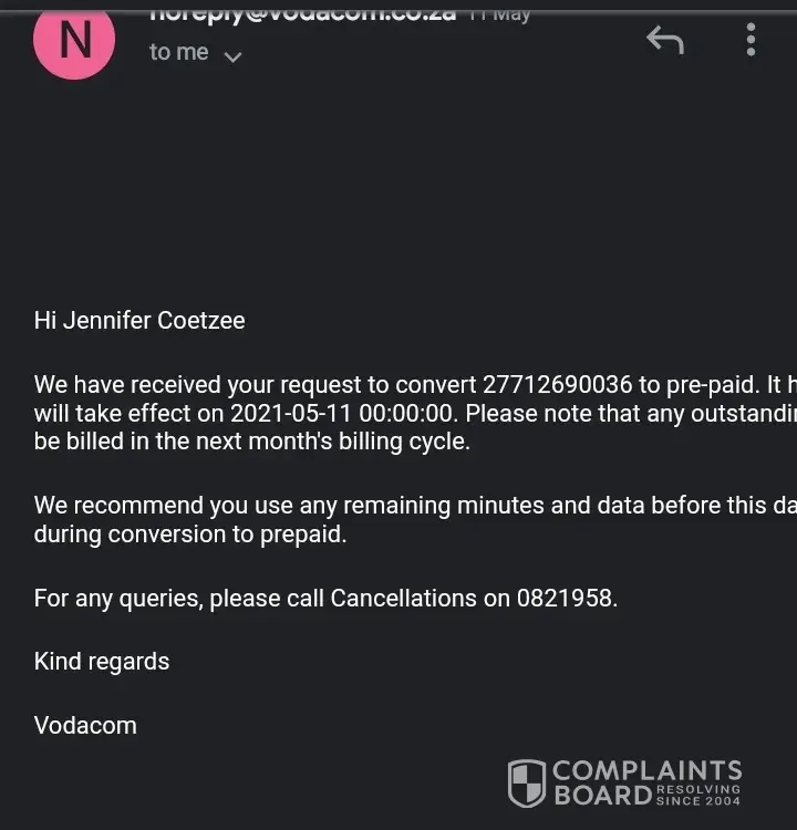 I have been trying to cancel one of my Vodacom contracts since the 29th April 2021 - when it was due to expire. I have phoned the' cancellations Department' 15 times, spoken to different consultants, and they could see from the records I had phoned numerous times, and to date, no cancellation seems to have been done. I have received two e-mails saying that it has been logged to prepaid and will take effect with from 11.05.2021. Yesterday, another e-mail received, which is the same as the previous one with the date now 06.06.2021. I went into a Vodacom Store and they confirmed it has been cancelled.