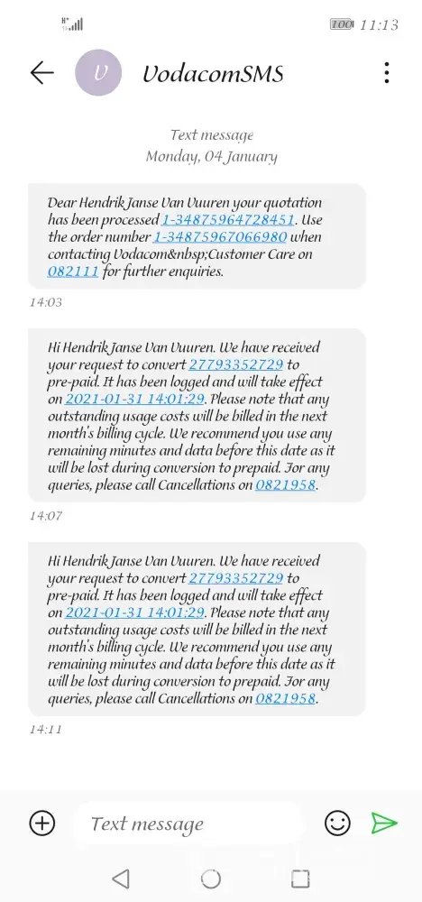I was sold a false expensive contract on the 2nd october 2020... Now that on the 8th feb 2021 vodacom cancel all services on my phones.