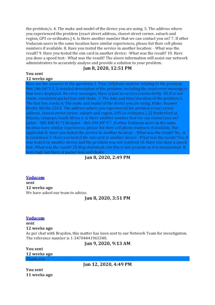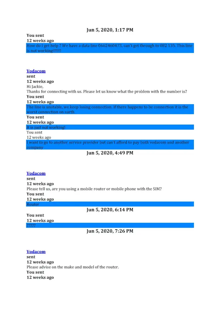 I took out at 50GB data line with router from Vodacom, which my two sons were meant to use in Musina Limpopo. Over this period of time we have logged numerous calls because this line has been intermittently available. Unfortunately I never thought it would amount to this so I have not kept reference of all of these calls that were logged, but I am sure that Vodacom should have some record of all the calls.