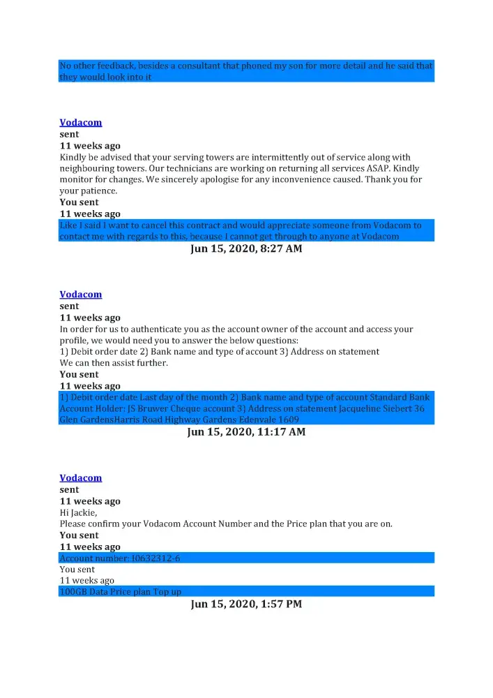This started on the 16th July at 10:18 when I first called vodacom to advise them that they had not debited my account and that I needed an invoice. I spoke to a consultant Amanda stating she would log a call with finance and that I should make a manual payment in the interim just to make sure my fibre was not cut. so she logged 2 references one to generate an invoice and the other to fix the debit order as she said that it was cancelled as I requested a cancellation quote in april