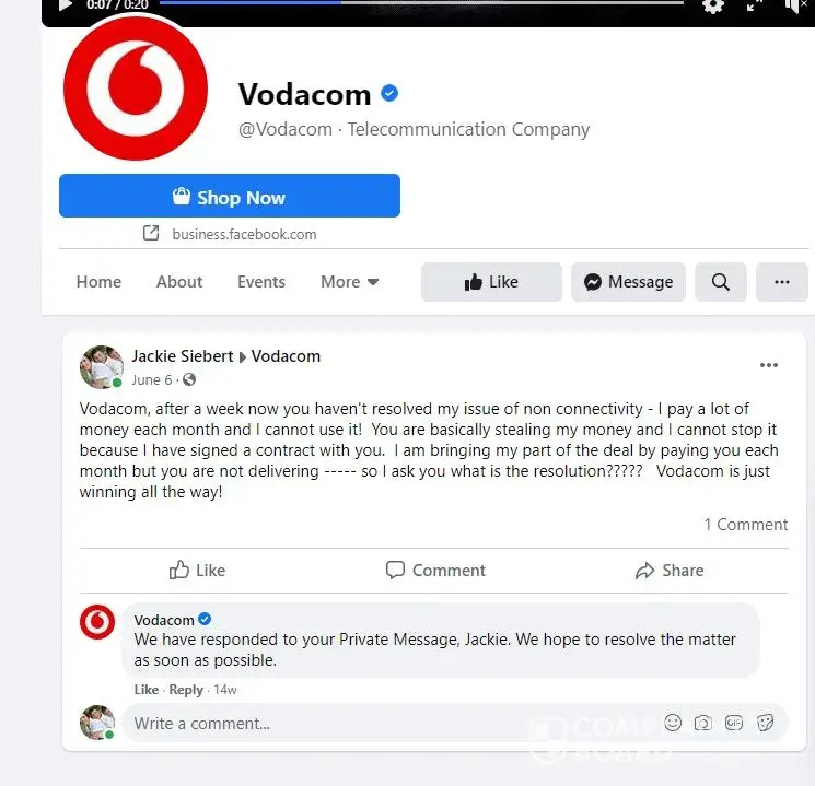 The problem with this line was not fixed. I was unable to get through to Vodacom to try and sort out the problem or follow up on the call logged or "investigation into the problem", I am not sure if it was due to COVID but you couldn't get through to the call centre and after holding for almost 30 minutes the calls were disconnected. Not being able to get hold of anyone, I took to social media and made a post on Vodacom's facebook page, please refer to screenshot of post made on Facebook. It wasn't long before I got a response on Facebook messenger, but this was also in vain because nothing came of this effort. I am unable to attach the Facebook Messenger communication but will gladly email it to someone for review.