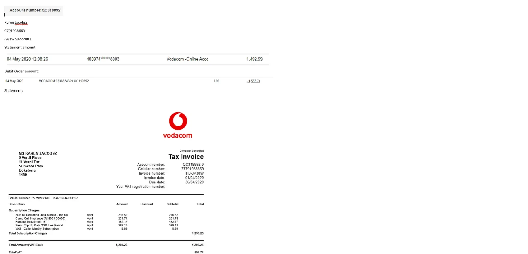 Then on 1 May 2020, a debit order in favour of Vodacom goes through for R135 + bank charges of R19, for a terminated contract and for no airtime/data!