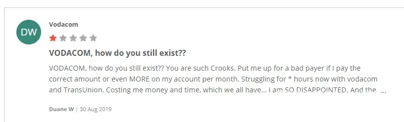 VODACOM, how do you still exist? You are such Crooks. Put me up for a bad payer if I pay the correct amount or even MORE on my account per month. Struggling for 3 hours now with vodacom and TransUnion. Costing me money and time, which we all have... I am SO DISAPPOINTED. And the last call of 6 I made to Vodacom, the consultant in the accounts department was so rude and sarcastic. WOW..