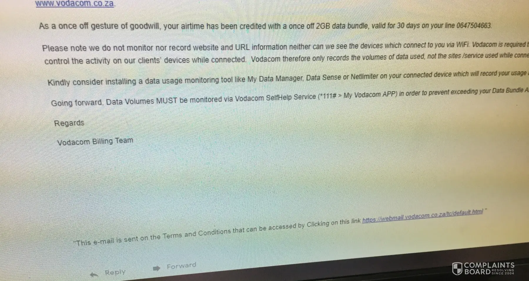 When I first escalated this issue, it was the 30 June 2019 where I had actually gone into a Vodacom shop (Blue Route Mall in CAPE TOWN) as I was in the mall and while sitting have breakfast (phone untouched), a whole 6GIGS had been depleted (SMS to confirm) which I showed to the Vodacom consultants assisting me. They had AGREED that there is some funny business as all the settings that would have potentially exhausted my data, were actually "disabled" on my phone. The Monday following, I received an SMS from Vodacom saying that I have in actual fact used all the data in question, that basically no funny business was going on and that as a "once-off gesture", they have credited my number with an extra 10GIGS on top of the 20GIGS that I got that day too (first day of the month). So to my absolute surprise this morning, just after 6am, I received an SMS from Vodacom to say ALL 30GIGS of my data has been depleted. I escalated the problem yet once again by calling "082155" (the data support line) and the lady on the other end escalated for me. I just a few minutes ago received a very familiar SMS from Vodacom saying that my query has been resolved and as a "once-off gesture" they have credited my number with 2GIGS! 2GIGS? That is not even close to the amount of data I should still be sitting with.