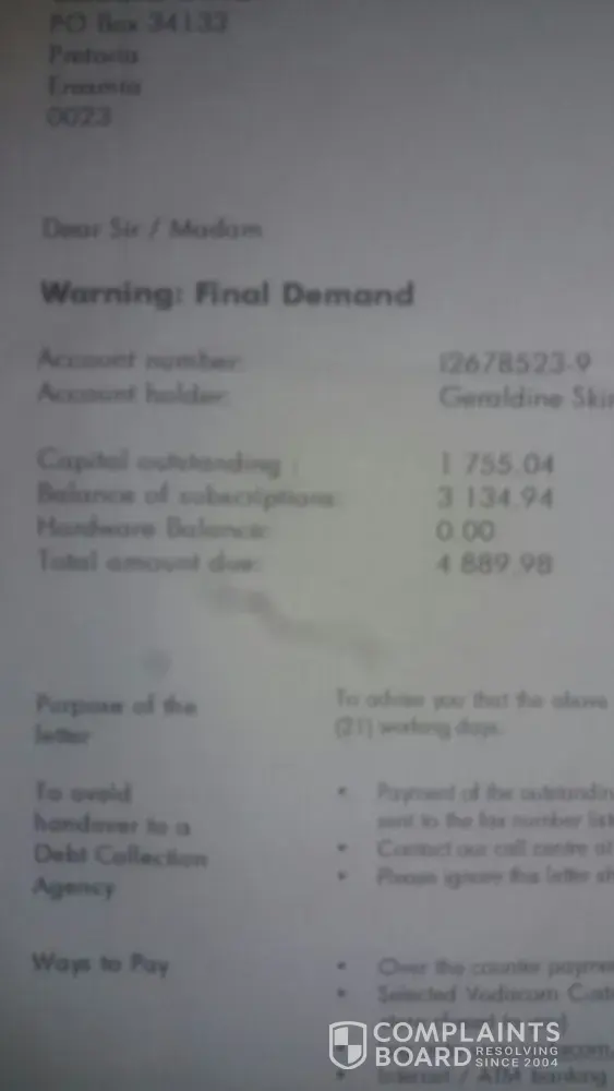 I'm longer that a year overseas already and after July 2017 there were no payments going of my husband's account for my phone. So I knew my contract ended. Now today I received a photo from my mother of a letter she received in the mailbox of a final demand letter from Vodacom with the amount due of R4889.98. I have never used that number ever since were overseas and I only loaded airtime on it so that the card will stay active and not lose that number.