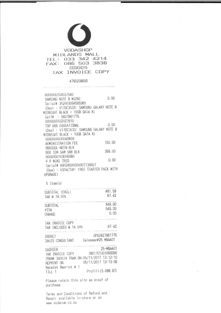 I went into Vodacom shop at Liberty Mall and I was told by both the Vodacom and Samsung salesmen that if I upgraded my contract to receive a Samsung Note 8 that I would receive a R5000 flight voucher. The Samsung salesman had a problem loading it and asked me to come back within the next week which I duely did. When they tried to load the voucher they then told me that I had taken out the contract 2 days early. I then asked to speak to the manager and she said she would sort the issue out. There was no signage showing dates etc and both salesmen confirmed they had told me that I would get the flight voucher. The manageress gave me another voucher code which I then submitted. I was called by someone who verified my submission but said I did not qualify for the flight voucher. I asked her to send me a mail with the information but I have had no correspondence. I have been mislead and was told that the problem was sorted out.