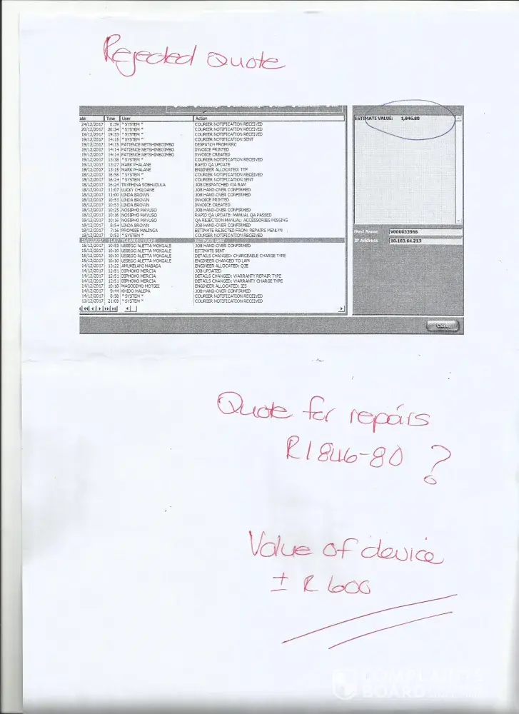 Please see attached proof where I booked it in as well as the quote received for fixing it for R1846.80 .