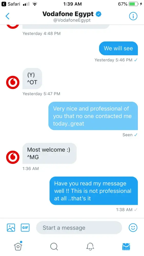 I have a serious complain on Vodafone Egypt customer service, i was travelling to Paris from the 14th to 17th this month and i called to open the roaming and i had a complain as well and i upgraded my package to traveller and the Customer service agent told me that i will be now enjoying 1.5 GB and 45 min free roaming to found out after i got back that my invoice came with almost 1.5 after dediction to an amount from a previous complain and when i called again they told me no you shouldn't enjoy the whole package and the customer service agent should have told you so since the i made a complian almost 5 days ago and no one contacted me for 48 hours and the when i called u told me u will call back and the they called twice while i was in a meeting and never again, when i came out i called you and someone said they will check and get back to me which didn't happen, the 2nd day i called 9 am and a lady teplied ok will check and no one called me for 13 hours till i called back and a totally unprofessional customer service replied that we closed your complain because u didn't reply and the told me the complain policy to call u 3 times and the again said that he don't know the policy and he has nothing to do with them, and that he is from another department and that i still should wait for someone to call me..which of ourse again never happened and finally your twitter account told me that they will contact me and then didn't happen and they were totally u professional in replying