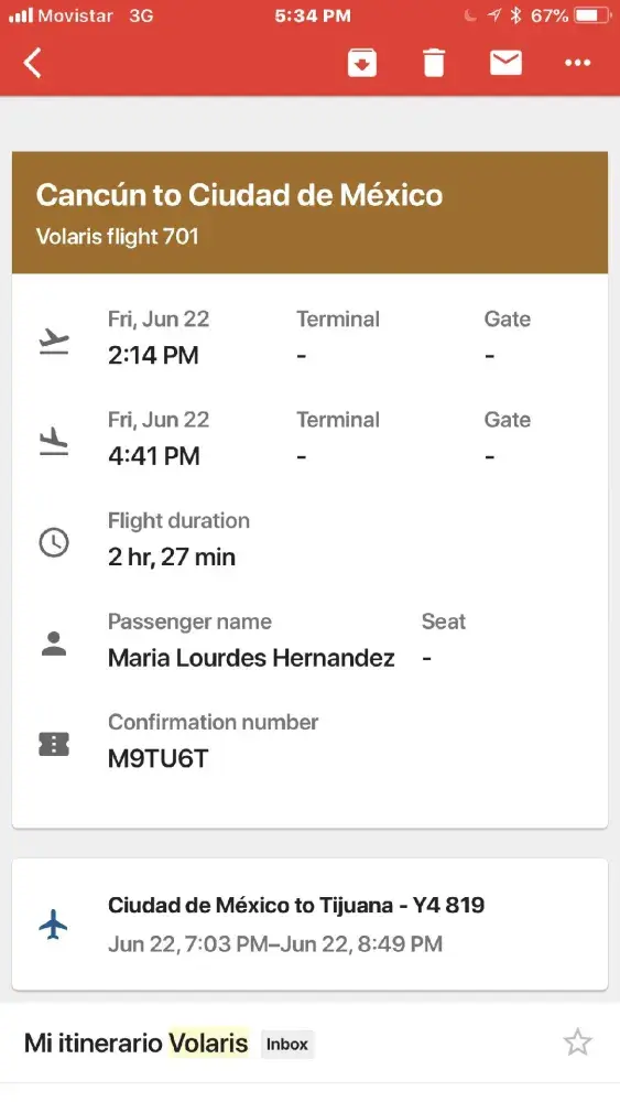 I checked in for our flight on June 13, 2018 without a problem. As you can see from the email below, Volaris emailed me, on June 11, 2018, that clearly states that our return flight confirmation was scheduled for Friday, June 22, 2018. on the day that I checked in to fly out of Tijuana. We flew out of Tijuana on June 15, 2018 as planned. However, the flight was delayed close to an hour. The flight out of Cancun went smoothly. We received excellent customer service as we arrived to the Cancun airport. Similarly, the flight crew were amazingly wonderful. When we arrived in Cancun the staff was delightful. However, they did misplace one of the luggage. The missing luggage was delivered to the resort the next day at 12:00 pm. This was a enormous inconvenience because we did not have our attire or clothing for our excursion that say. Money lost on our part. Furthermore, Volaris did not offer to compensate us or even give us a discount on a future flight.